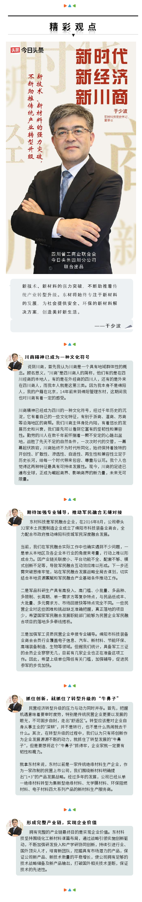 作為川內(nèi)新材料行業(yè)的排頭兵、國內(nèi)絕緣材料企業(yè)領(lǐng)軍企業(yè)的帶頭人,日前,四川東材科技集團(tuán)股份有限公司公司黨委書記、董事長于少波作為新川商代表接受了《今日頭條》的專訪,分享了他對(duì)于新川商、軍民融合產(chǎn)業(yè)發(fā)展、民營企業(yè)轉(zhuǎn)型升級(jí)的看法以及未來規(guī)劃等內(nèi)容。